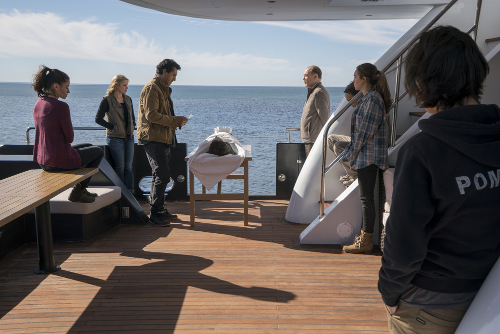 Já navegando a bordo de Abigail, os tripulantes encontram sobreviventes à deriva. Alicia (Alycia Debnam-Carey) e Madison se comovem e estão decididas a resgatar àquelas pessoas. Entretanto, Victor Strand (Colman Domingo) relembra a todos que eles estão sobre o iate dele e que ele já foi misericordioso demais ao ajuda-los. Contrariado de inicio, Travis compreende o que Strand fala e é questionado por Madison. Ele tenta a convencer que a maior preocupação deles agora deve ser a sobrevivência e que, adicionar ao iate mais pessoas seria utopia e acabaria por causar grandes problemas, principalmente por conta de mantimentos. A relação entre os dois parece estar num ponto de colisão. Madison parece querer ser a heroína do mundo, enquanto Travis pende a ser o herói de si mesmo.